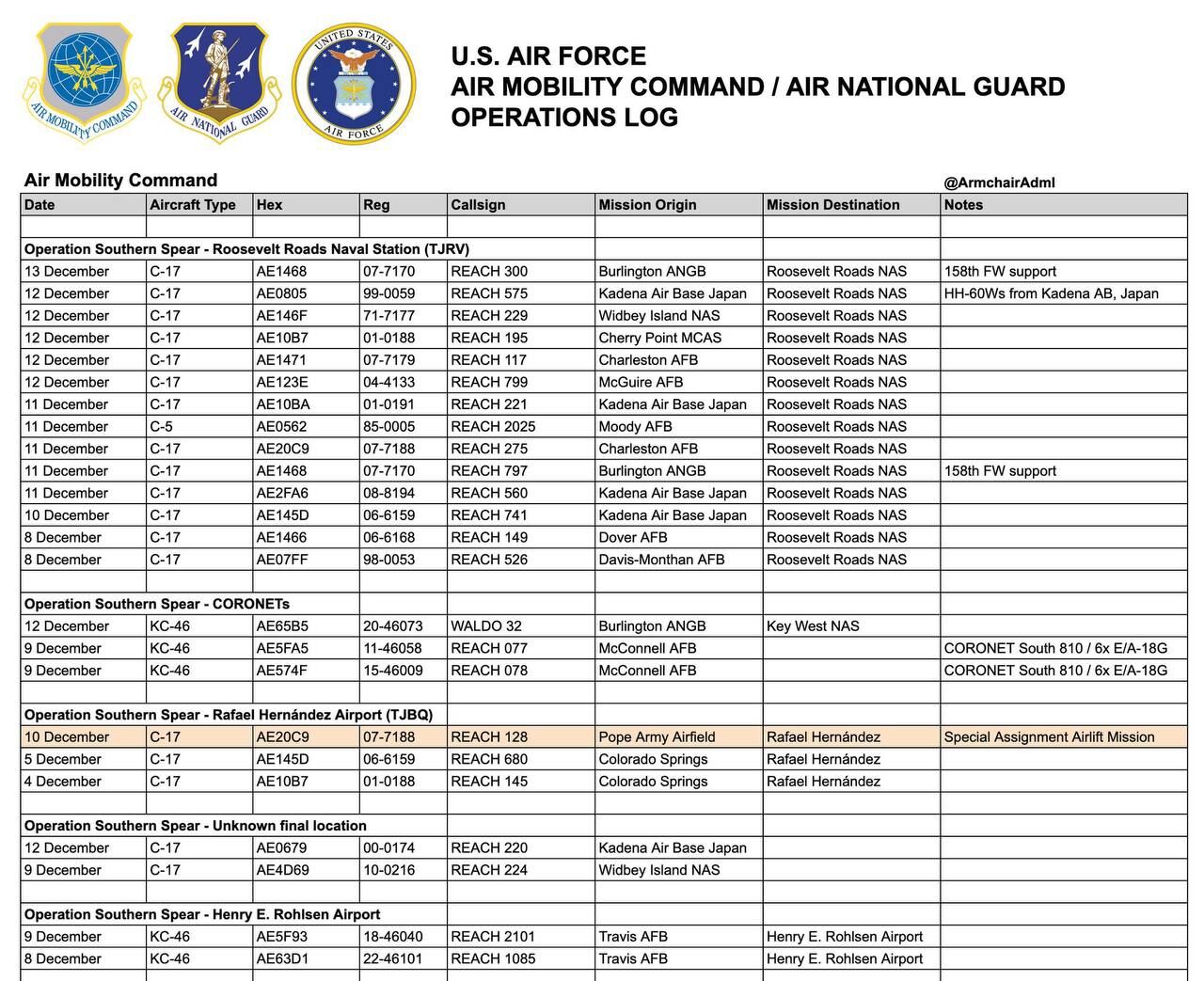 Bảng dưới đây hiển thị dữ liệu chuyến bay từ nhiều căn cứ Không quân Hoa Kỳ đến các căn cứ trong và xung quanh Puerto Rico. Dữ liệu này dành cho giai đoạn từ ngày 8 đến 13 tháng 12 và chưa phải là số liệu cuối cùng.