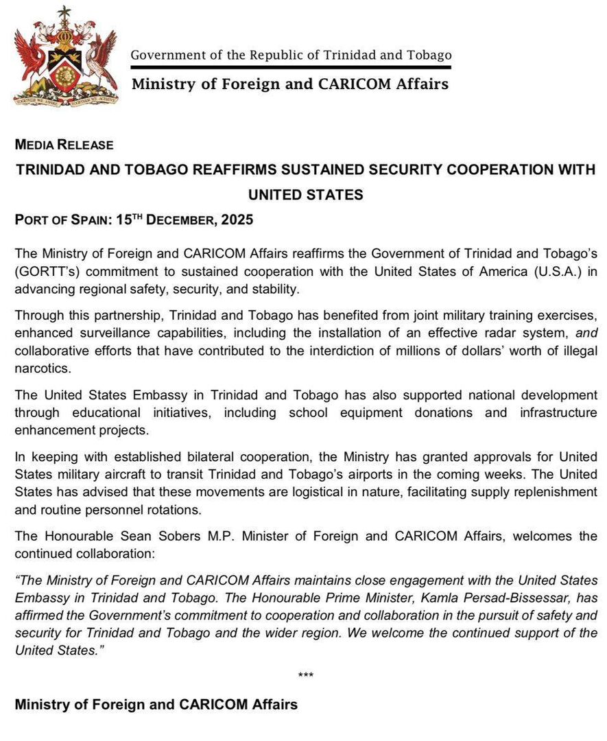 Chính phủ Cộng hòa Trinidad và Tobago đã ra tuyên bố khẳng định sự hợp tác liên tục với Hoa Kỳ, mà họ cho rằng đã mang lại lợi ích thông qua các cuộc tập trận quân sự chung, tăng cường khả năng giám sát và lắp đặt hệ thống radar hiệu quả, cũng như cho phép máy bay quân sự Hoa Kỳ quá cảnh qua các sân bay của Trinidad và Tobago trong những tuần tới.