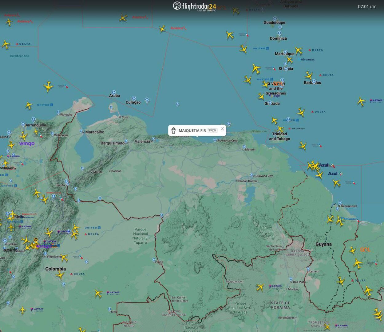 Flightradar24 hiện không theo dõi bất kỳ máy bay nào bay trên không phận Venezuela.