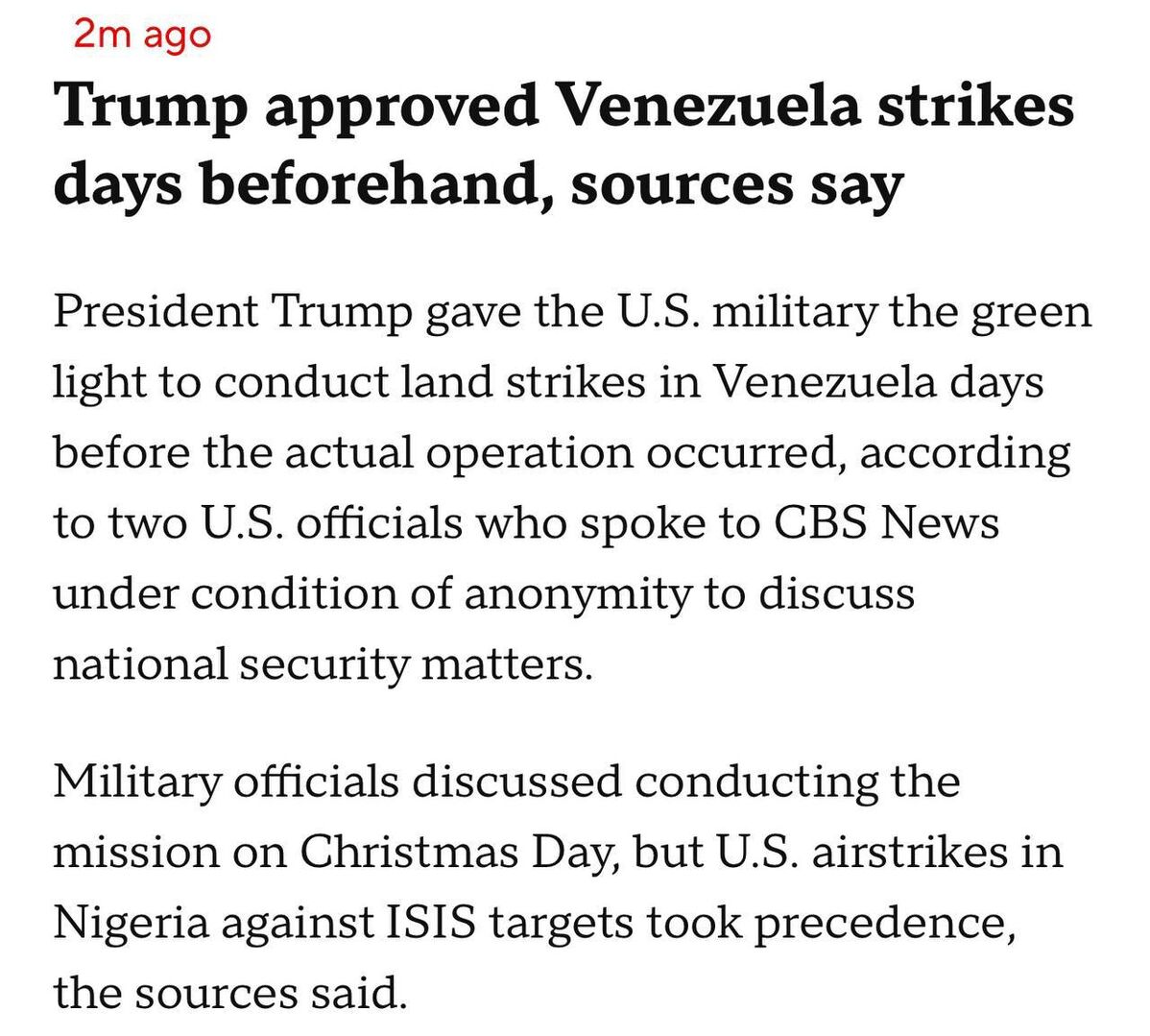 Tổng thống Mỹ Donald Trump đã bật đèn xanh cho Lầu Năm Góc tiến hành các cuộc tấn công trên bộ ở Venezuela vài ngày trước khi chiến dịch bắt đầu. Các quan chức đã thảo luận về khả năng thực hiện nhiệm vụ vào ngày Giáng sinh, nhưng các cuộc không kích nhằm vào các mục tiêu của ISIS ở Nigeria được ưu tiên hơn, hai quan chức Mỹ nói với CBS News.