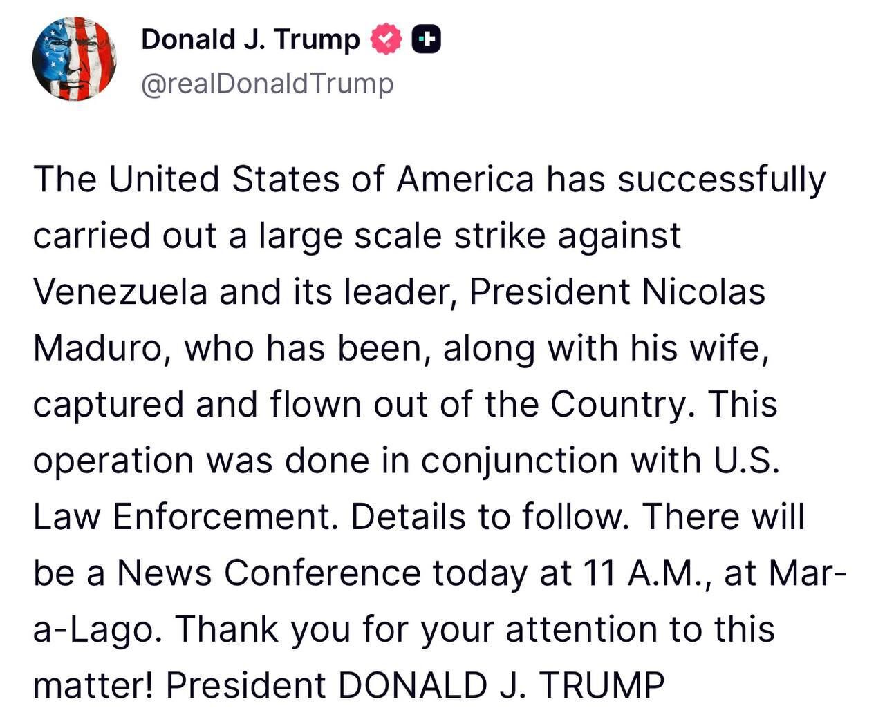 Tổng thống Mỹ Donald Trump tuyên bố đã bắt giữ thành công Tổng thống Venezuela Nicolás Maduro và vợ trong một chiến dịch được thực hiện tối nay tại thủ đô Caracas của Venezuela.