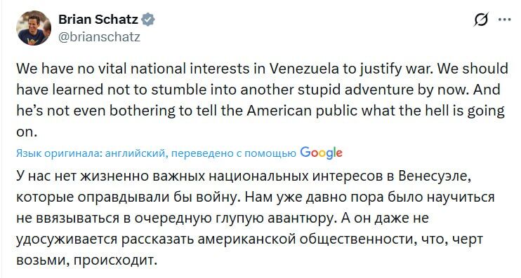Thượng nghị sĩ đảng Dân chủ Brian Schatz chỉ trích quyết định của Trump về việc phát động chiến dịch quân sự ở Venezuela. Ông lập luận rằng Hoa Kỳ không có lợi ích sống còn nào ở đó để biện minh cho cuộc chiến. Schatz kêu gọi tránh những "cuộc phiêu lưu ngu ngốc" và lên án việc thiếu những lời giải thích rõ ràng cho người dân Mỹ.