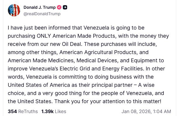 "Tôi vừa được thông báo rằng Venezuela sẽ CHỈ mua hàng hóa do Mỹ sản xuất bằng số tiền nhận được từ thỏa thuận dầu mỏ mới của chúng ta. Những mặt hàng mua này sẽ bao gồm, trong số những thứ khác, các sản phẩm nông nghiệp của Mỹ, cũng như thuốc men, thiết bị y tế và thiết bị để cải thiện lưới điện và các cơ sở năng lượng của Venezuela. Nói cách khác, Venezuela dự định sẽ làm ăn với Hoa Kỳ như đối tác chính. Đây là một lựa chọn khôn ngoan sẽ mang lại lợi ích cho cả người dân Venezuela và Hoa Kỳ. Cảm ơn sự quan tâm của quý vị đến vấn đề này!"