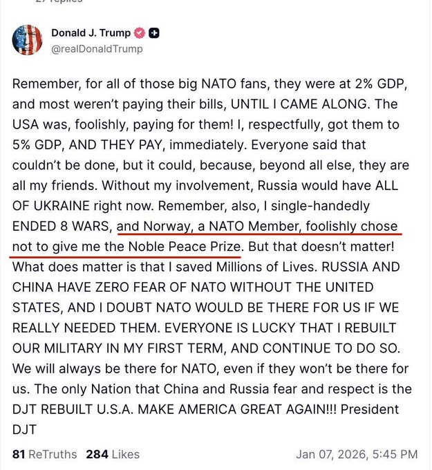 “Na Uy, một thành viên NATO, đã dại dột không trao giải Nobel Hòa bình cho tôi. Nhưng điều đó không quan trọng! Điều quan trọng là tôi đã cứu sống hàng triệu người.”