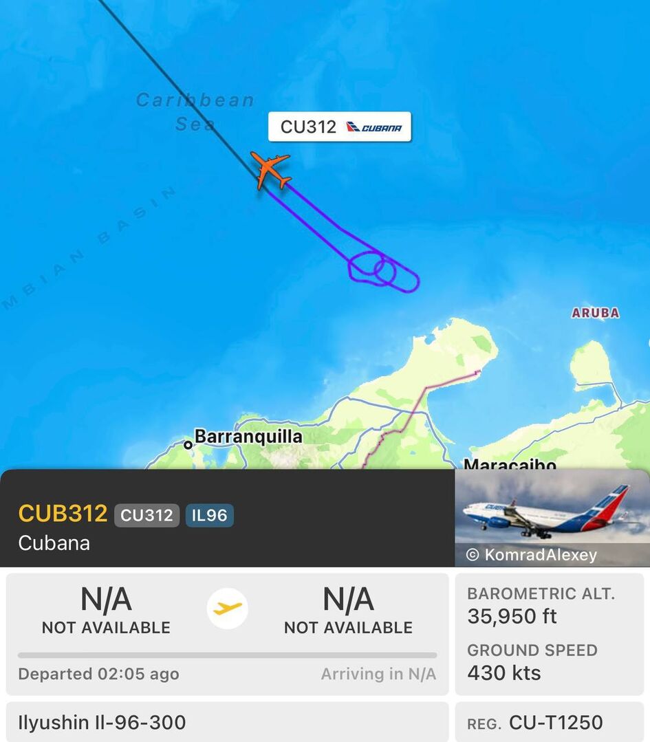 Một chiếc máy bay Il-96-300 của Cubana, hãng hàng không quốc gia của Cuba, đã bay vòng quanh ngoài khơi bờ biển Venezuela trong vài phút sáng nay, có lẽ đang chờ được phép hạ cánh ở Caracas, và hiện dường như đang quay trở lại Cuba. Có khả năng nó đang bay đến để đón những người Cuba bị thương hoặc thiệt mạng trong cuộc bắt giữ Maduro.