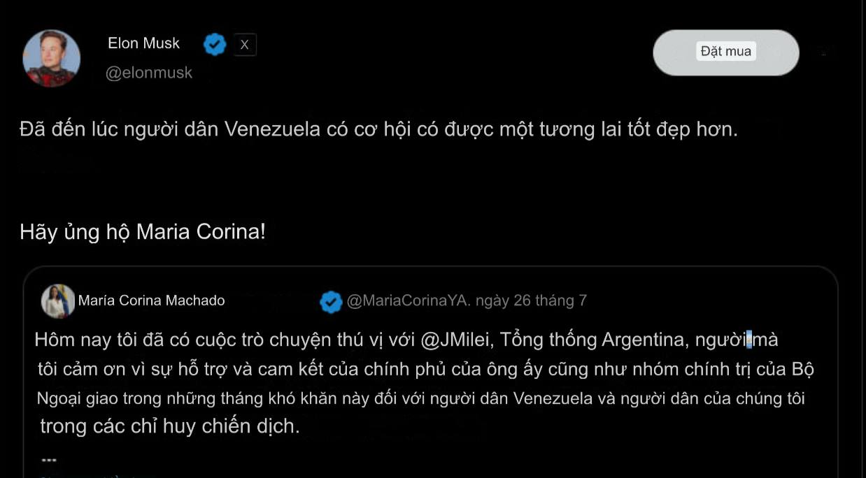 Elon Musk tuyên bố ủng hộ nhân vật đối lập Venezuela Maria Corina Machado trong cuộc bầu cử ở Venezuela - người vừa tiếp xúc với Milei, tổng thống của Argentina