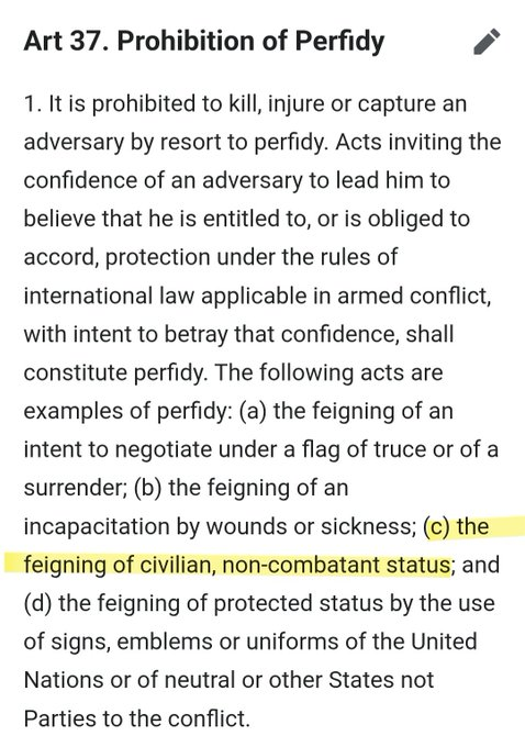 Điều 37. Cấm hành vi phản trắc 1. Nghiêm cấm giết hại, làm bị thương hoặc bắt giữ đối phương bằng thủ đoạn phản trắc. Các hành vi lấy lòng tin của đối phương để khiến họ tin rằng mình có quyền hoặc có nghĩa vụ phải bảo vệ theo các quy tắc của luật pháp quốc tế áp dụng trong xung đột vũ trang, với ý định phản bội lòng tin đó, sẽ cấu thành hành vi phản trắc. Các hành vi sau đây là ví dụ về hành vi phản trắc: (a) giả vờ có ý định đàm phán dưới cờ đình chiến hoặc cờ đầu hàng; (b) giả vờ bị thương hoặc ốm đau dẫn đến mất khả năng chiến đấu; (c) giả vờ là thường dân, không tham chiến; và (d) giả vờ được bảo vệ bằng cách sử dụng các dấu hiệu, biểu tượng hoặc đồng phục của Liên Hợp Quốc hoặc của các quốc gia trung lập hoặc các quốc gia khác không phải là các bên tham chiến.