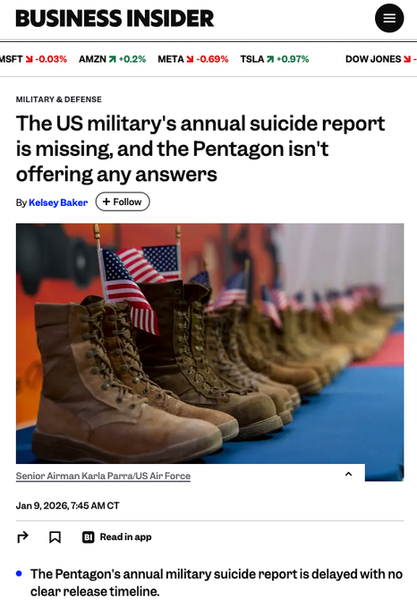 BUSINESS INSIDER Mục QUÂN SỰ & QUỐC PHÒNG Báo cáo tự tử thường niên của quân đội Mỹ bị thất lạc, và Lầu Năm Góc không đưa ra bất kỳ câu trả lời nào. Bởi Kelsey Baker