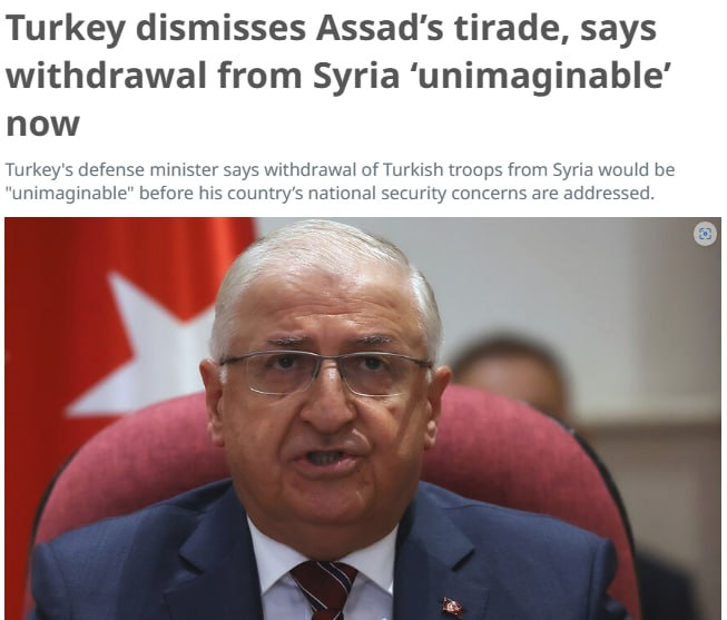 🇹🇷❌🇸🇾 Bộ trưởng Quốc phòng Thổ Nhĩ Kỳ Yasar Guler bác bỏ yêu cầu của Tổng thống Syria Bashar al-Assad về việc Thổ Nhĩ Kỳ rút quân khỏi phần phía bắc của đất nước bị chiến tranh tàn phá, nói rằng kết quả như vậy là không thể nếu không có Ankara “đảm bảo” an ninh biên giới.