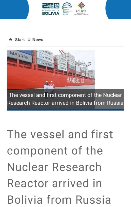 ➡️Tàu mang lò phản ứng nghiên cứu hạt nhân ứng nghiên cứu được thiết kế đặc biệt để chứa lõi lò phản ứng. “Tàu lò phản ứng của Bolivia được đóng tại Nga bởi Tập đoàn Nhà nước Nga ROSATOM. Trước khi giao hàng, các cuộc kiểm tra đã được thực hiện để xác minh rằng việc sản xuất đã được thực hiện theo tiêu chuẩn quốc tế và tất cả các biện pháp kiểm soát chất lượng đã được thông qua", chuyên gia của ABEN cho biết.