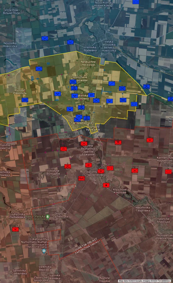 Ở Mặt trận Nam Donets, sau khi quân đội Nga rút khỏi Urozhaynoe, ngôi làng chuyển sang vùng xám <Thực chất thì quân Ucraine đãchiếm được làng này, cũng như Staromayorskoe lúc trước. >. Sự kiểm soát chắc chắn của kẻ thù chỉ được duy trì ở vùng ngoại ô phía bắc, ở phía nam, Lực lượng Vũ trang Ukraine đang cố gắng tiến vào, nhưng họ đang bị pháo binh và máy bay tấn công. Tuy nhiên, hai nhóm biệt kích từ các trung đoàn bộ binh 35 và 37, được hỗ trợ bởi pháo binh sử dụng đạn chùm, đã tấn công các vị trí của Lực lượng Vũ trang Nga gần Zavitne Bazhenya, nhưng cuộc tấn công đã bị đẩy lùi. Cùng lúc đó, một máy bay không người lái R18 của Ukraine đang hoạt động trên không.