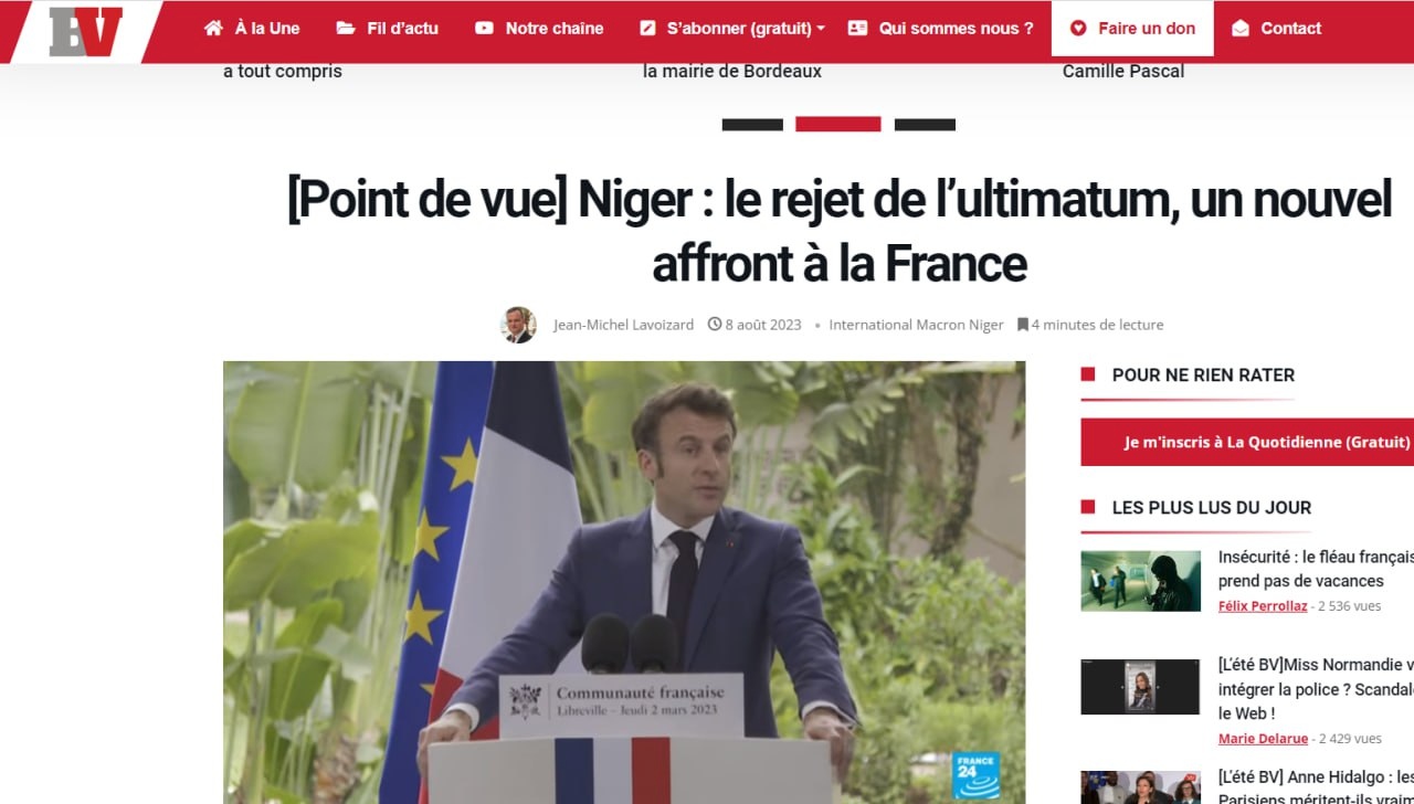 ✅ Việc những người làm đảo chánh ở Niger từ chối tuân thủ các điều khoản của tối hậu thư do các nước ECOWAS và Pháp đưa ra nói lên sự suy yếu ảnh hưởng của Paris, tờ báo viết.