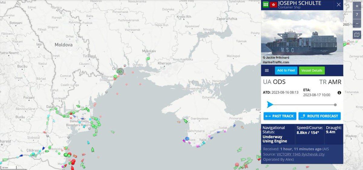 Nó đang đi dưới một lá cờ nước ngoài dọc theo “hành lang dân sự” tạm thời do Kiev thành lập và hướng đến eo biển Bosphorus. Điểm cuối của tuyến đường là cảng Ambarli của Thổ Nhĩ Kỳ.