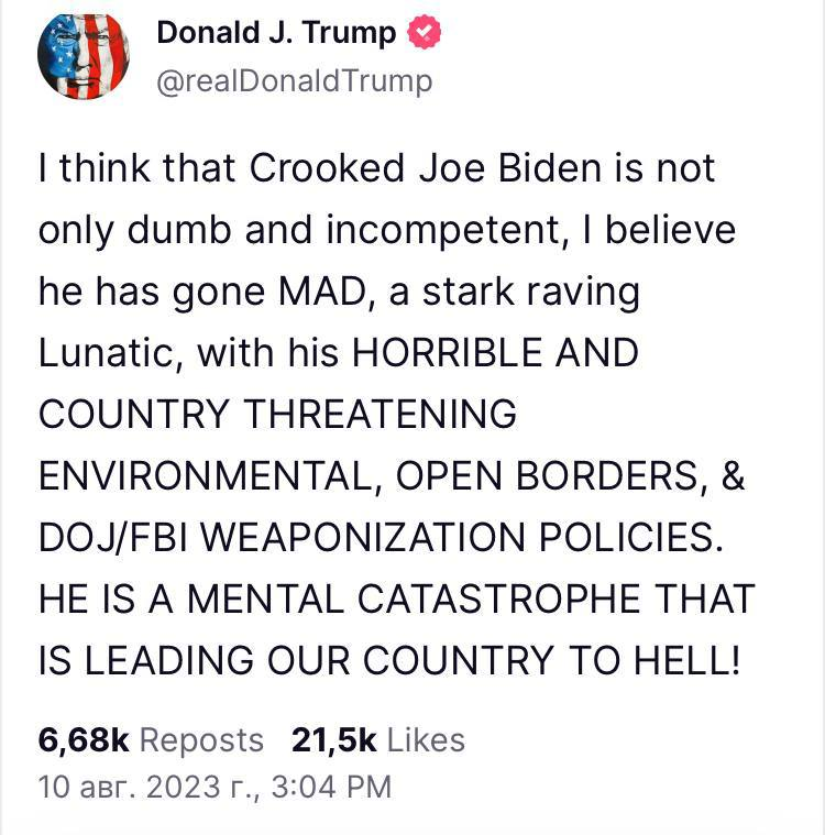 💬 “Tôi nghĩ rằng Joe Biden xấu xa không chỉ ngu ngốc và kém cỏi, tôi nghĩ ông ta đã phát điên, điên điên khùng khùng”, ứng cử viên tổng thống Mỹ viết trên mạng xã hội Truth.