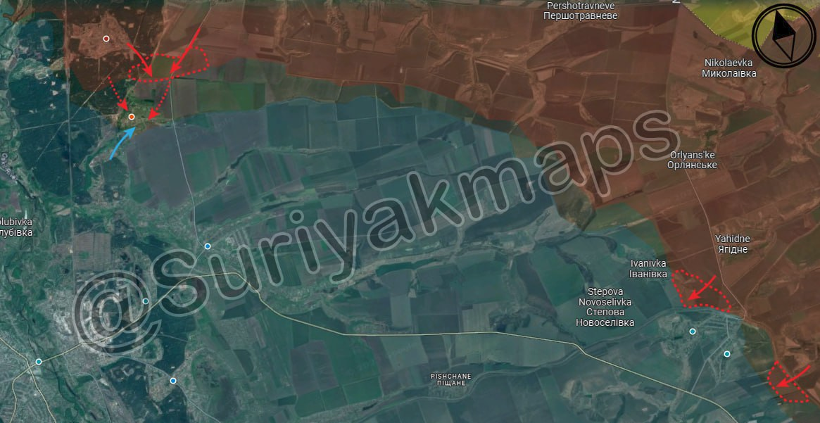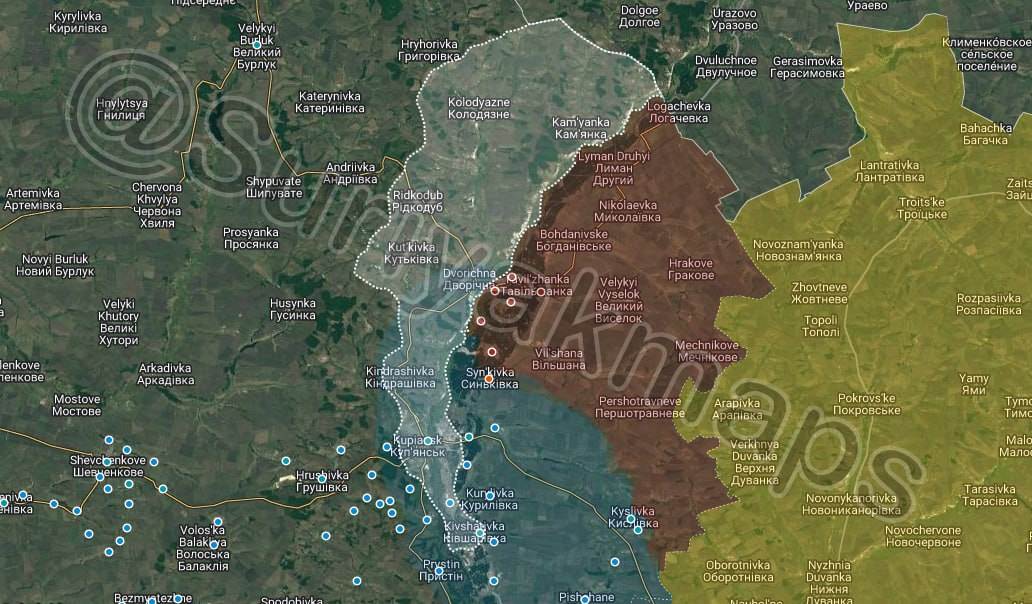 Tình hình ở mặt trận đông bắc: Quân đội Nga đã có những bước tiến mới ở phía nam Lyman Pershyi/Лиман Перший tiến tới thị trấn Syn'kivka/Синьківка, nơi đang diễn ra các cuộc đụng độ với Quân đội Ukraine. Hơn nữa, Quân đội Nga cũng đã đạt được một số tiến bộ xung quanh các thị trấn Kyslivka/Кислівка và Kotlyarivka/Котлярівка nhờ các thế trận.