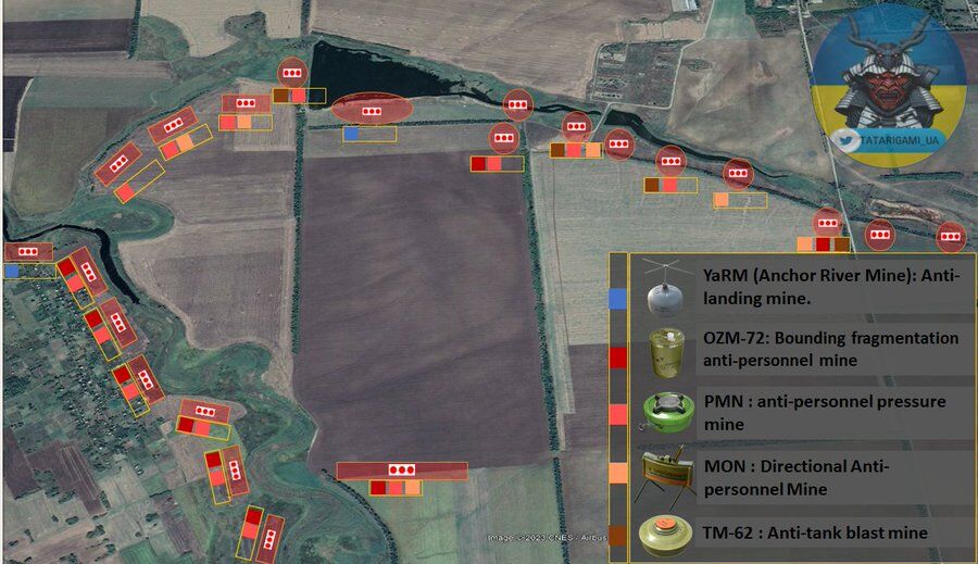 Trong trường hợp này, việc định vị các bãi mìn gắn liền với các đặc điểm bề mặt, bao gồm các vùng nước, đường xá và các khu định cư. Điều quan trọng cần lưu ý là có hai loại bãi mìn: "nhóm mỏ" và bãi mìn được kiểm soát (có thể được quản lý từ xa). Các bãi mìn thường bao gồm một loạt các loại mìn riêng biệt, cụ thể là mìn sát thương phân mảnh OZM-72 Bounding, mìn sát thương PMN, mìn sát thương định hướng MON, mìn nổ chống tăng TM-62 và Mìn chống đổ bộ YaRM. Theo cách tiếp cận phổ biến, người Nga thường kết hợp nhiều loại mìn khác nhau thay vì chỉ sử dụng một loại. Để làm cho mọi thứ rõ ràng và dễ hiểu hơn, tôi đã chỉ định một màu khác nhau cho từng loại mỏ và nhóm chúng theo đó để thể hiện trực quan. Ở những khu vực mà các đội trinh sát của chúng tôi có khả năng đổ bộ sau khi băng qua các vùng nước, mìn chống đổ bộ YaRM được đặt. Các con đường dẫn đến các hàng cây và các bãi đáp có thể xảy ra được bảo vệ bằng các mìn OZM và MON. Các khu vực còn lại thường được bao phủ bởi mìn sát thương PMN. Rõ ràng, vị trí của các bãi mìn khác nhau về độ sâu, để lại những khoảng trống giúp người Nga linh hoạt điều hướng, quản lý các bãi và rút lui. Tuy nhiên, tính toán sơ bộ cho thấy khu vực này ước tính có khoảng 10.416 quả min thuộc các loại khác nhau