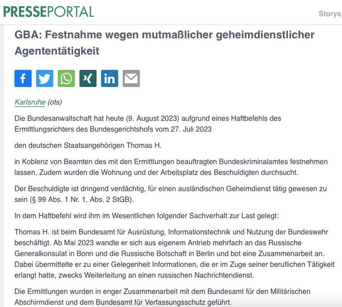 Văn phòng Công tố Liên bang của Cộng hòa Liên bang Đức đã bắt giữ Thomas H., người mà từ tháng 5, theo sáng kiến của riêng mình, đã liên hệ với Lãnh sự quán Nga ở Bon và Đại sứ quán Nga ở Berlin, đề nghị hợp tác.