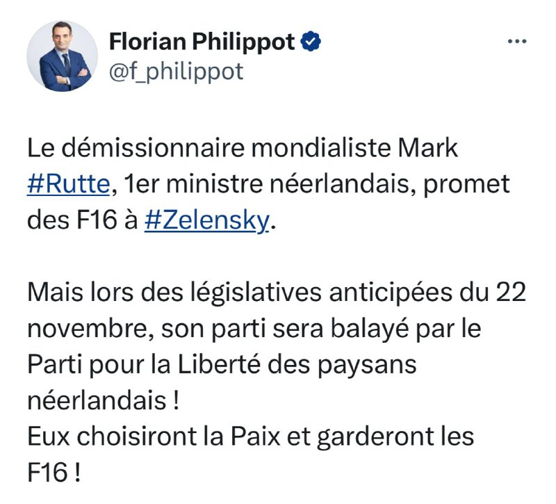 🇳🇱🇺🇦 Mark Rutte đã hứa với Zelensky về F-16, nhưng ông ấy sẽ không nắm quyền được lâu và Ukraine sẽ không nhận được gì, - Florian Filippo, lãnh đạo đảng Những người yêu nước của Pháp