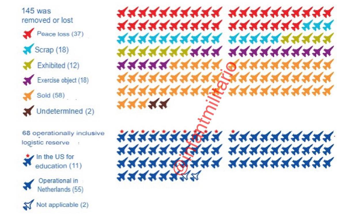 Một đồ họa thông tin thú vị về tình trạng của phi đội máy bay chiến đấu F-16 của Không quân Hà Lan. Cần chú ý đến tỷ lệ tai nạn ở mức 19% của phi đội.