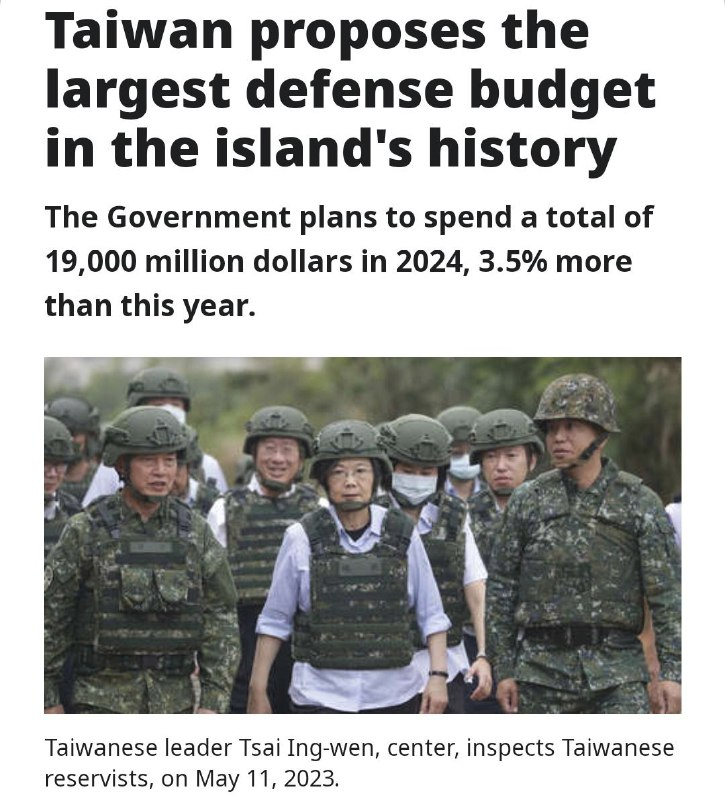 🇹🇼 💲 ⚔️ Đài Loan có kế hoạch tăng chi tiêu quốc phòng thêm 3,5% lên mức kỷ lục 606,8 tỷ đô la địa phương (19 tỷ đô la Mỹ) vào năm 2024, theo đề xuất ngân sách mà chính phủ đệ trình lên lãnh đạo hòn đảo, Thái Anh Văn.