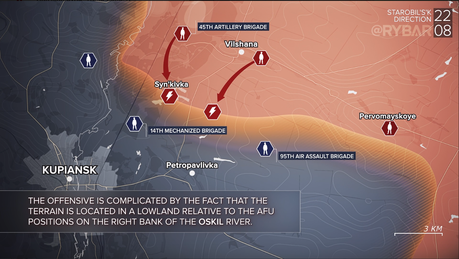 ▪️Tại khu vực Kupyansky, quân đội Nga tiếp tục tấn công các tuyến phòng thủ của địch ở Sinkovka và phía nam Olshany. Cuộc tấn công rất phức tạp do địa hình nằm ở vùng đất thấp so với vị trí của Lực lượng vũ trang Ukraine ở hữu ngạn sông Oskol.