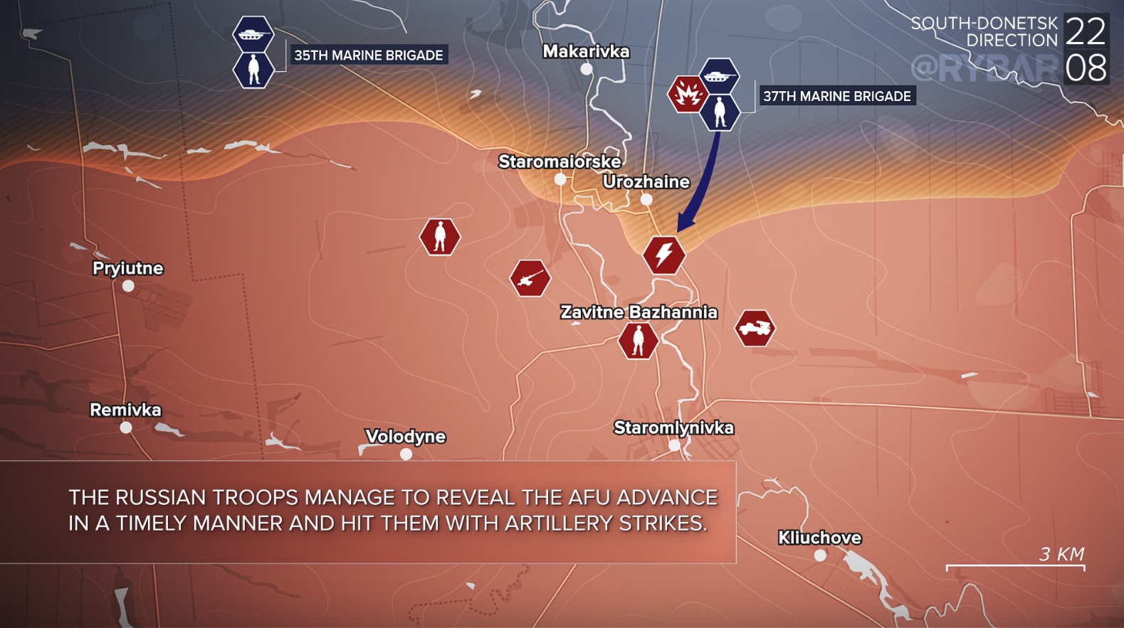 ▪️Tại khu vực Vremievsky, địch tiếp tục tập hợp lại và tấn công các vị trí của Nga ở phía nam Urozhaynoye. Quân đội Nga đã kịp thời mở cuộc tiến công của Lực lượng Vũ trang Ukraine và yểm trợ họ bằng các cuộc tấn công bằng pháo binh.