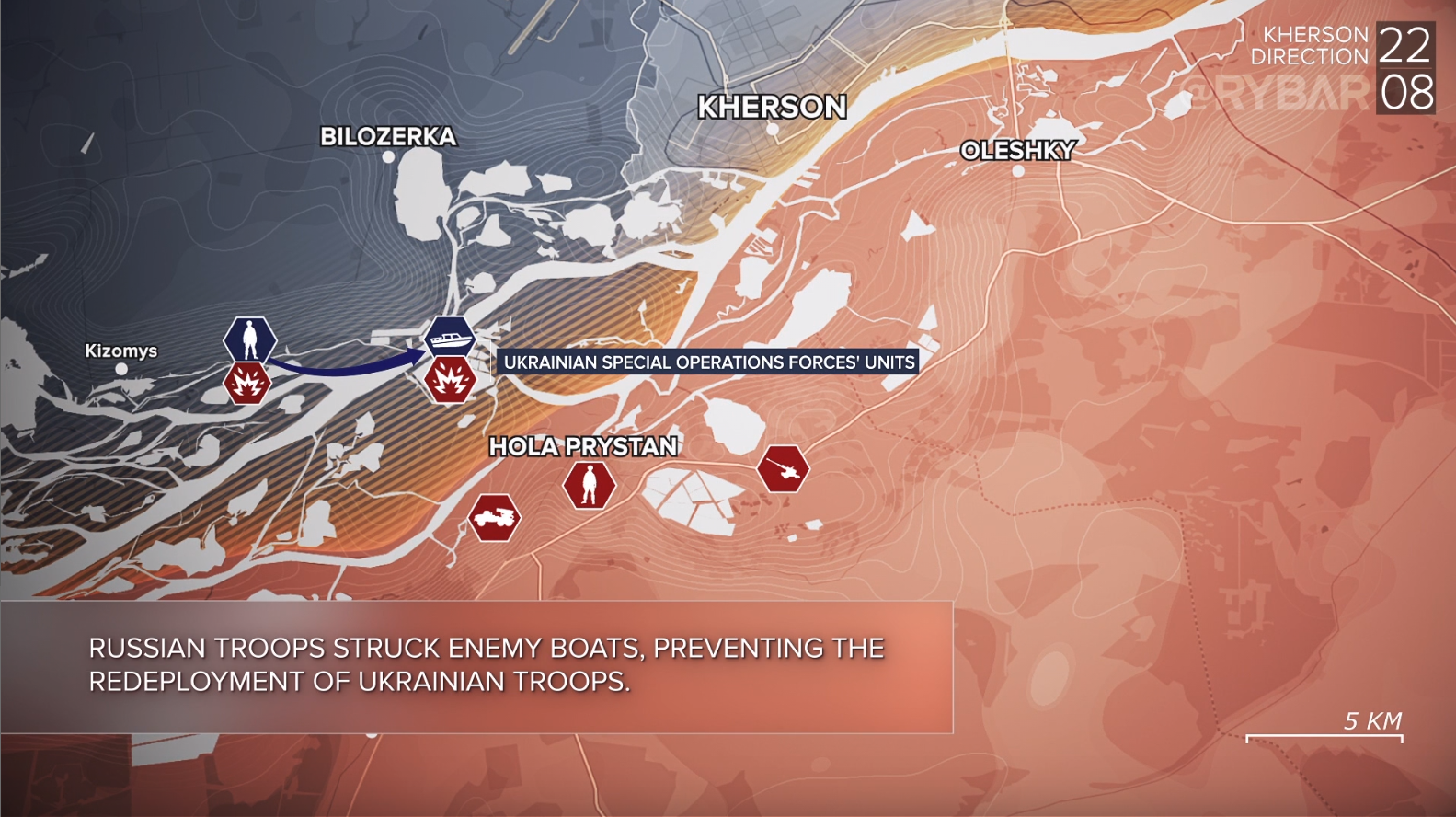 ▪️Theo hướng Kherson, Lực lượng vũ trang Ukraine một lần nữa cố gắng tăng cường tập trung trên các đảo ở đồng bằng Dnieper. Quân Nga tấn công tàu địch, cản trở việc chuyển quân của quân Ukraine.