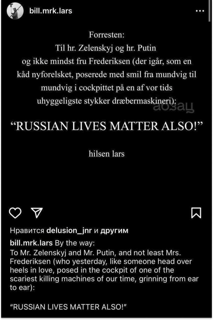 “Gửi ông Zelensky và ông Putin, và bà Frederiksen (người hôm qua đã tạo dáng, cười toe toét, yêu nhau say đắm, trong buồng lái của một trong những cỗ máy giết người khủng khiếp nhất của thời đại chúng ta): Mạng sống của người Nga cũng quan trọng!” đạo diễn viết .