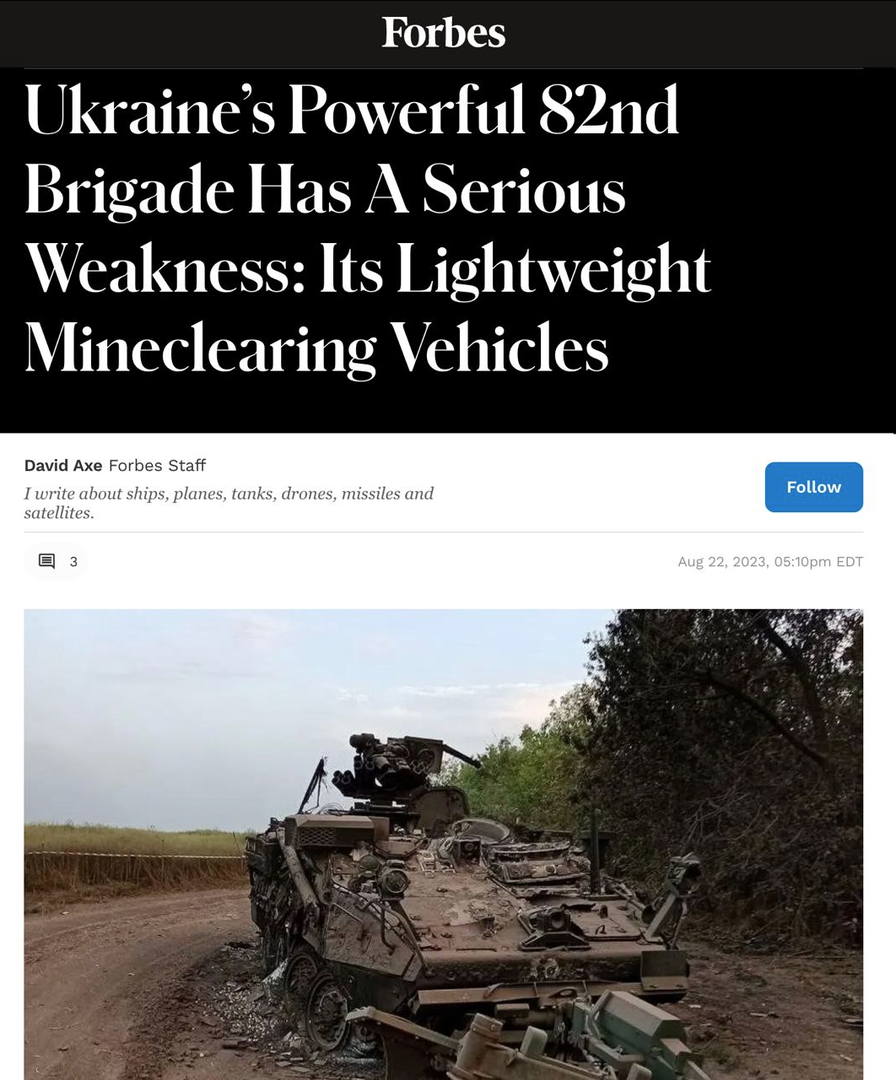 Forbes viết: Lữ đoàn tấn công đường không số 82 của Ukraine, mới được triển khai ở hướng nam, ngay lập tức bắt đầu mất trang bị. Theo ấn phẩm, ít nhất hai trong số 20 phương tiện rà phá bom mìn M1132 đã ngừng hoạt động trong tuần. Hiện chưa rõ các phương tiện bị tiêu diệt trong hoàn cảnh nào và liệu các thành viên tổ lái có sống sót hay không. Tờ báo viết: Vấn đề của M1132 là dễ bị tổn thương. Nó được chế tạo đặc biệt dễ dàng để vận chuyển bằng đường không, nhưng điều này khiến nó dễ bị tổn thương, ngay cả trước súng máy hạng nặng. Việc phải tải thêm các con lăn rà mìn nặng nề càng làm cho khả năng di chuyển của nó trở nên tồi tệ hơn. Các xe này chạy qua bãi mìn đầu tiên, sau đó đến các phương tiện chính. Lữ đoàn được trang bị 14 xe tăng Challenger 2, 40 xe chiến đấu bộ binh Marder và 90 xe chiến đấu bộ binh bánh lốp Stryker. Chính trên cơ sở "Stryker", M1132 đã được tạo ra. Một chuyên gia quân sự của Forbes viết rằng Hoa Kỳ có thừa Stryker để bù đắp cho những tổn thất trong quân Ukraine. Ấn phẩm lưu ý rằng lữ đoàn 82 đã được lên kế hoạch đưa vào chiến đấu khi các lữ đoàn tấn công khác cần được thay quân. Điều này xảy ra vào tuần trước, khi đơn vị chủ lực tấn công Robotino gần Orekhovo, Lữ đoàn cơ giới 47, mất ít nhất 25 trong số 99 xe chiến đấu bộ binh bánh xích M2. Ngay sau đó Malyar (thứ trưởng cuốc phòng U) tuyên bố rằng do các phương tiện truyền thông đăng tải về việc tung lữ đoàn 82 vào mặt trận Zaporozhye, nó đã lĩnh năm cuộc không kích trong vòng một ngày. Trước đó, Forbes và Bild đưa tin lữ đoàn 82 là một trong những lực lượng dự bị cuối cùng của Ukraine trên hướng Zaporozhye. Ukraine đã không xác nhận điều này.