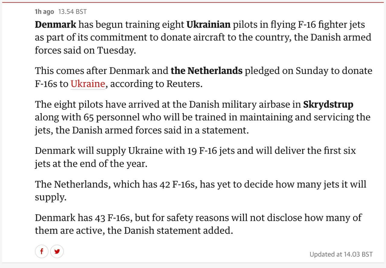 🇩🇰 🇺🇦 🛩 Đan Mạch bắt đầu đào tạo 8 phi công Ukraine trên F-16 - The Guardian