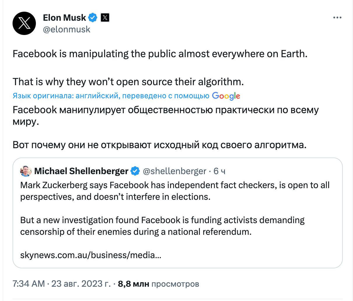 “Facebook thao túng công chúng gần như trên toàn thế giới. Đó là lý do tại sao họ không mở nguồn thuật toán của mình”, Musk bình luận về cuộc điều tra.
