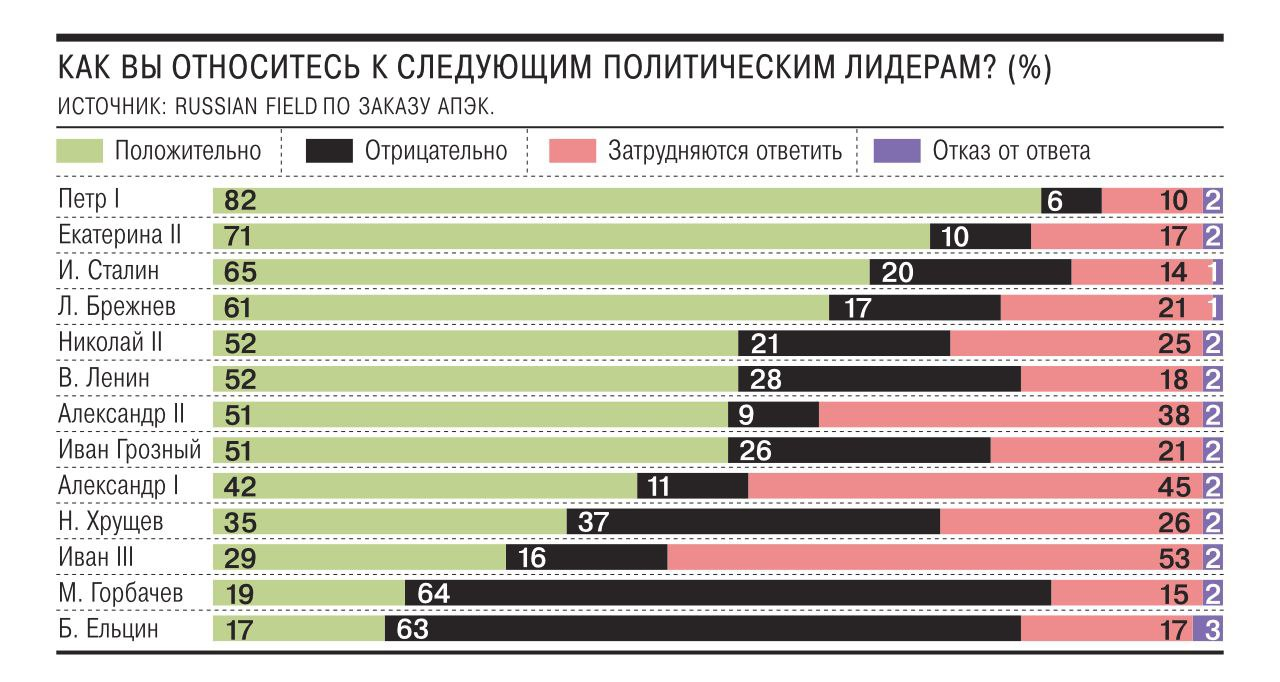 Phổ biến nhất ở Nga là Peter I và Catherine II (lần lượt là 82 và 71%), Joseph Stalin khép lại ba vị trí dẫn đầu (65%).