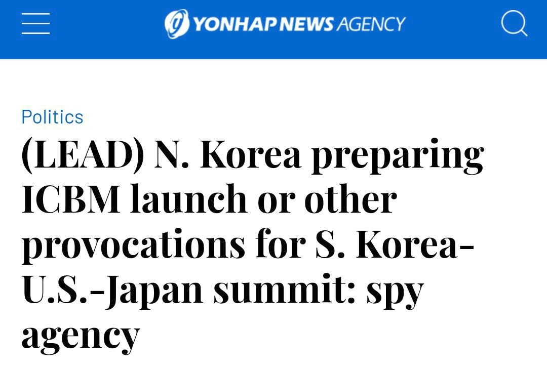 🇰🇵 ❌ 🇰🇷 Triều Tiên đang chuẩn bị thực hiện nhiều "hành động khiêu khích quân sự", trong đó có việc phóng tên lửa đạn đạo liên lục địa (ICBM), nhân dịp hội nghị thượng đỉnh ba bên sắp tới giữa Hàn Quốc, Hoa Kỳ và Nhật Bản hoặc Hàn Quốc. Hàn Quốc-Mỹ cuộc tập trận quân sự, một nhà lập pháp cho biết hôm thứ Năm.