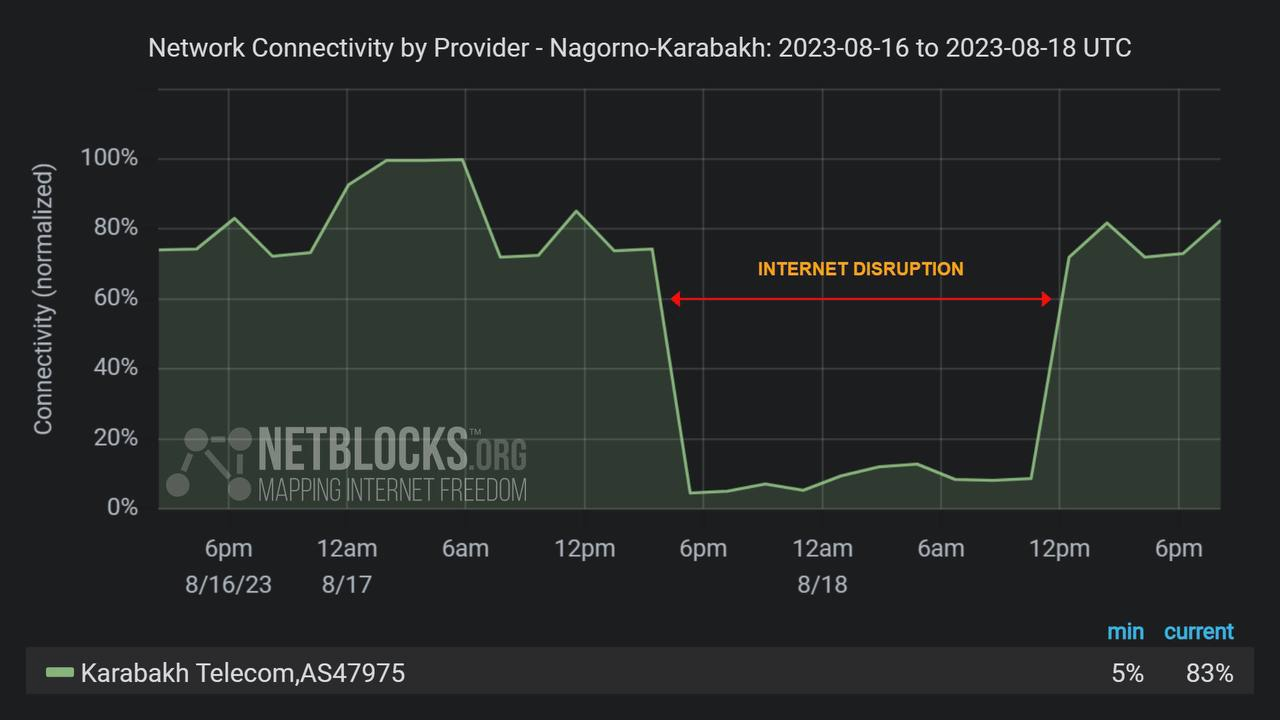 Dữ liệu mạng cho thấy sự gián đoạn đáng kể đối với kết nối Internet ở Nagorno-Karabakh vào thứ Năm, ngày 17 tháng 8.