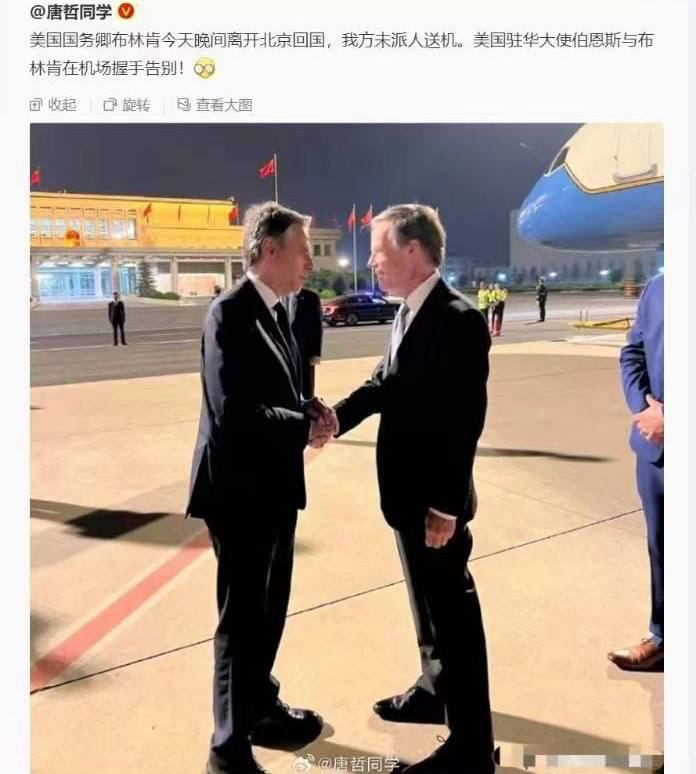Không ai trong số các quan chức Trung Quốc đưa tiễn ngoại trưởng Mỹ Antony Blinken tại sân bay Bắc Kinh. Truyền thông Trung Quốc đưa tin chỉ có đại sứ Mỹ Burns đưa tiễn ông sếp của mình.