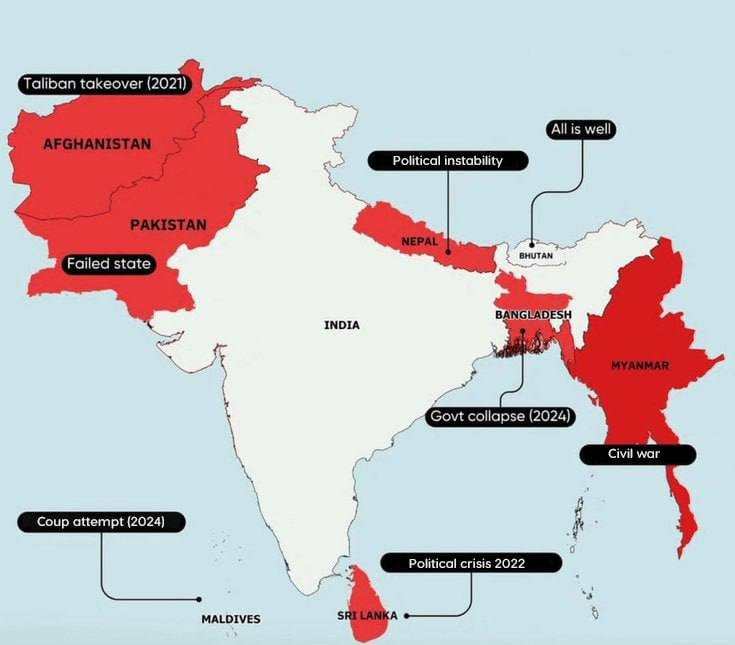 Khu vực lân cận của Ấn Độ hiện cực kỳ bất ổn, với các cuộc đảo chính thực tế hoặc âm mưu xảy ra ở hầu hết các quốc gia Nam Á.
