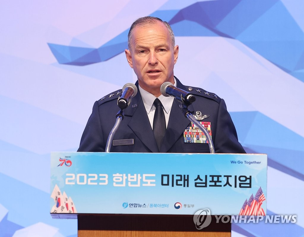 Trung tướng Scott L. Pleus, Phó Tư lệnh Lực lượng Hoa Kỳ tại Hàn Quốc, phát biểu trong một diễn đàn hòa bình do Hãng thông tấn Yonhap và Bộ Thống nhất tổ chức tại một khách sạn ở trung tâm Seoul vào ngày 29 tháng 6 năm 2023. (Yonhap)