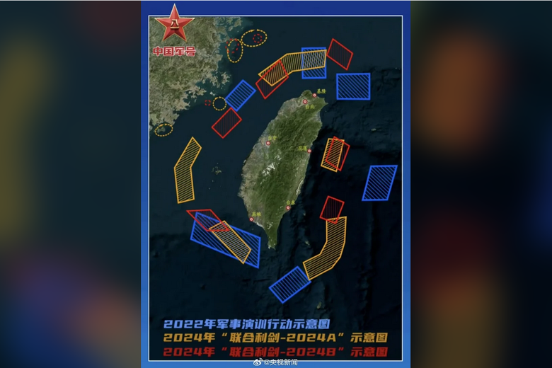 4h sáng hôm nay (giờ Việt Nam), Trung Quốc phát động cuộc tập trận quân sự Joint Sword 2024B, các điểm tập trận bao bọc xung quanh đảo Đài Loan, cuộc tập trận do Chiến khu miền Đông của PLA thực hiện, cuộc tập trận bao gồm các biên đội tàu chấp pháp hải cảnh số 2901, 1305, 1303, 2102, các lực lượng lục quân, hải quân, không quân, tên lửa cũng tham gia tập trận tại các khu vực thuộc eo biển 2 bờ, khu vực phía bắc, phía nam, phía đông đảo Đài Loan, nội dung diễn tập nhấn mạnh tuần tra chuẩn bị tác chiến trên không trên biển, phong toả và khống chế khu vực cảng khẩu, tấn công hải đối đất, đổ bộ chiếm và khống chế các hạng mục tổng hợp. Cuộc tập trận được dự báo trước sau bài diễn thuyết liên quan đến quan điểm về Tổ quốc của Lại Thanh Đức trong buổi kỷ niệm Song Thập của Đài Loan.
