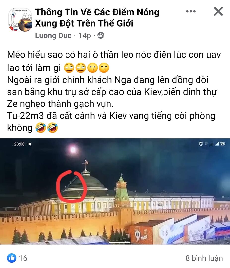 Nhiều cụ cho rằng đây là khổ nhục kế hoặc cờ giả để Nga có cớ tẩn U, nhưng em nghĩ khác, có lẽ đây là đám Diều hâu hơn ở phía U âm mưu loại bỏ anh Dê ( vì tổ chức đánh thằng vào điện Cremlin thế này thì chúng suy ra phản ứng của Nga rất thảm khốc, và anh Dê đang ở nước ngoài sẽ không dám về khi Nga đánh lớn vào Kiev, các nơi công quyền khác, đám này ở trong nước toàn quyền điều khiển quân đội để tổ chức phản công ( việc này anh Dê đang trì hoãn) để làm vừa lòng quan thầy ( Mỹ ), và cũng có thể do Tình báo Mỹ, đám Tình báo quân đội U tổ chức thực hiện.