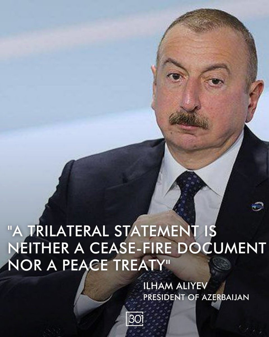 Ông tuyên bố rằng Tuyên bố ba bên không phải là một lệnh ngừng bắn cũng không phải là một thỏa thuận hòa bình và đề xuất bình thường hóa quan hệ của Azerbaijan "xuất phát từ lợi ích của cả Baku và Yerevan." Aliyev đề cập rằng Baku đã gửi bốn phiên bản của dự thảo thỏa thuận hòa bình và đợi "hơn 40 ngày" để Yerevan phản hồi. Ông lưu ý rằng phía Armenia cuối cùng đã đệ trình phản hồi của mình "một tuần trước cuộc gặp ở Washington" vì họ hiểu rằng nếu không có điều này, cuộc gặp ở Washington sẽ hoàn toàn vô ích. Aliyev cũng nói thêm rằng Baku đã nhìn thấy các yêu sách lãnh thổ chống lại Azerbaijan trong các bình luận của Armenia về các phiên bản mới của dự thảo thỏa thuận hòa bình.