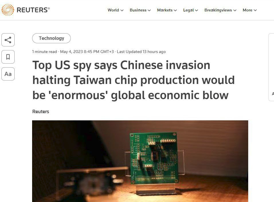 Giám đốc Tình báo Quốc gia Hoa Kỳ Avril Haynes, phát biểu trước Ủy ban Quân vụ Thượng viện, cho biết chip bán dẫn tiên tiến do Công ty TNHH Sản xuất Chất bán dẫn Đài Loan sản xuất được sử dụng trong 90% "hầu hết mọi loại thiết bị điện tử trên toàn thế giới."
