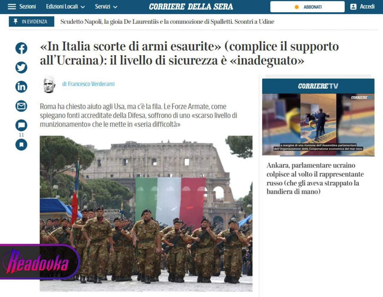 Tờ Corriere della Sera của Ý đưa tin rằng khả năng phòng thủ của Ý đã giảm xuống mức nghiêm trọng trong bối cảnh cung cấp vũ khí cho Ukraine