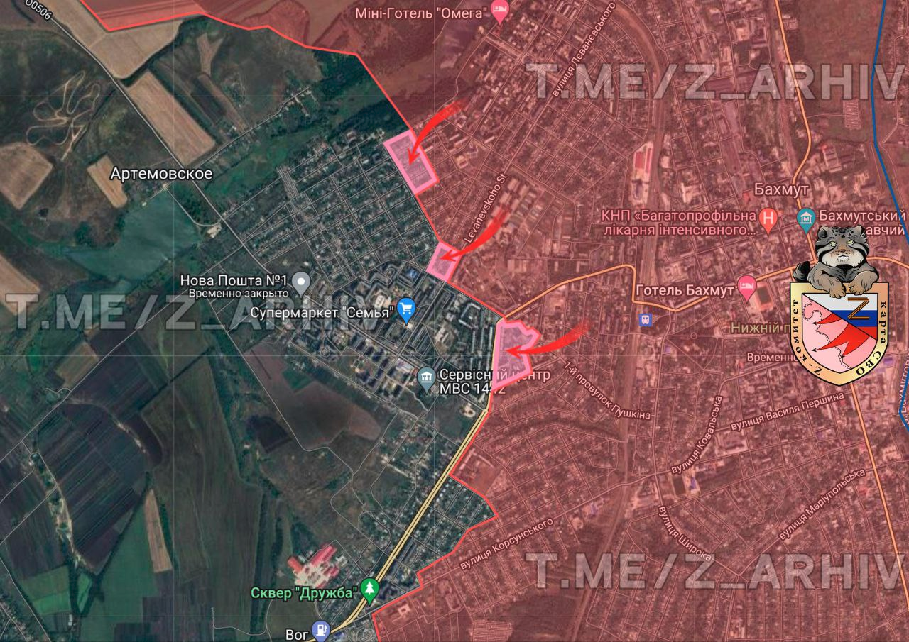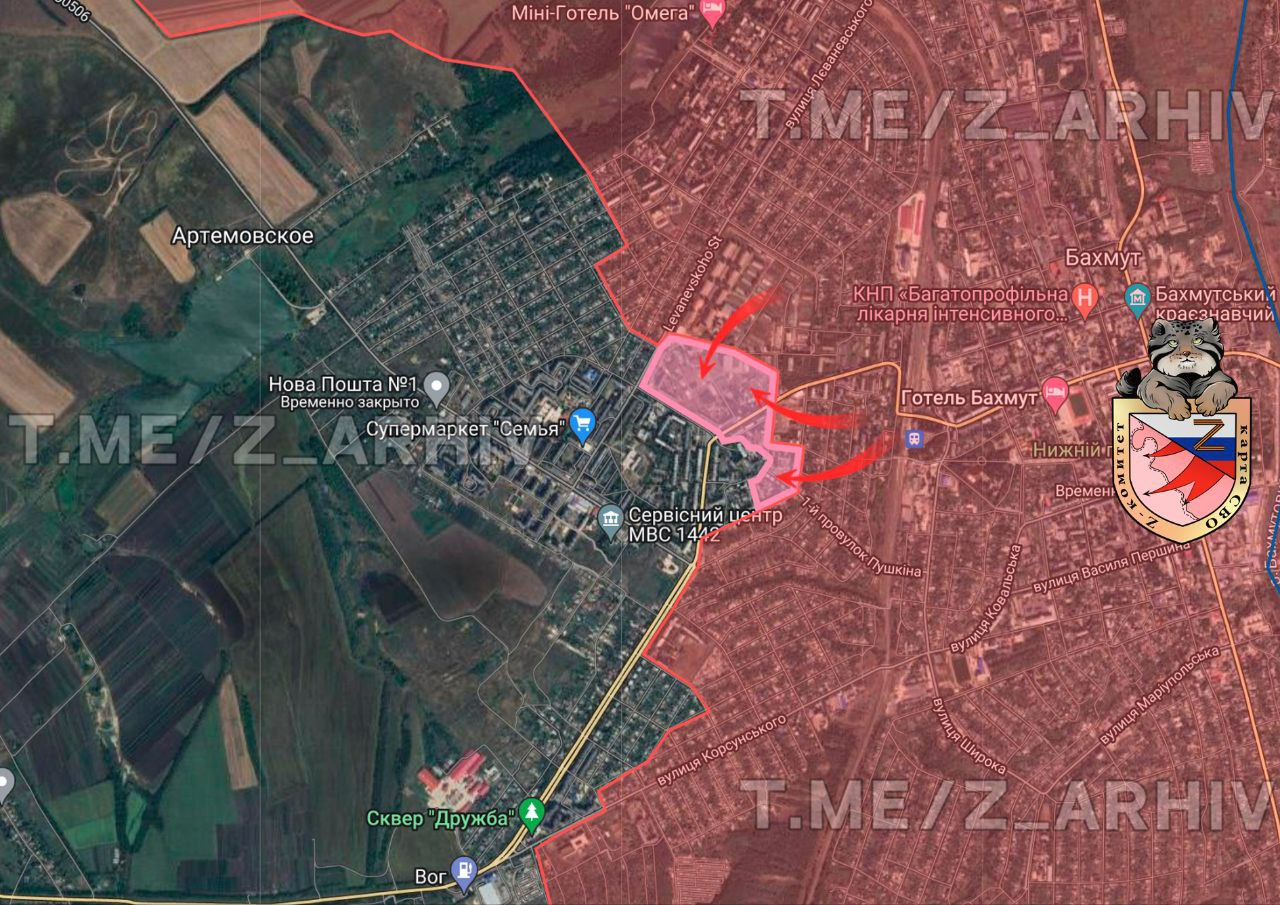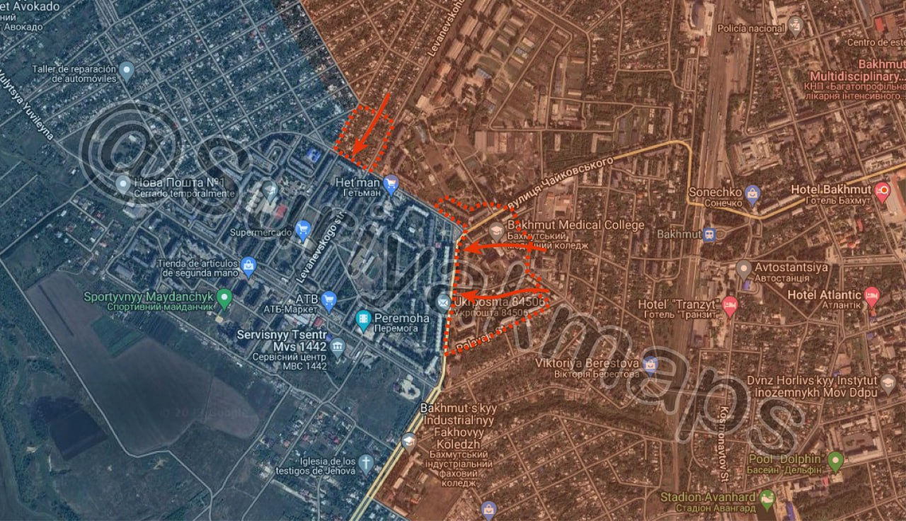 Ở phía bắc - họ đã đi đến Phố Matrosov, và cũng cố thủ trên Phố Những người giải phóng Donbass, sau khi chiếm được mdoanh trại quân đội Ukr cố thủ dọc phố Tchaikovsky từ trường cao đẳng công nghiệp Bakhmut trở lên.