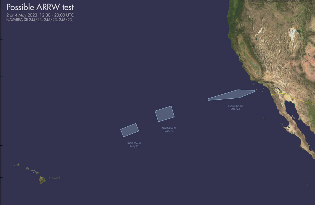🇺🇸 Lực lượng quân đội Hoa Kỳ ở bờ biển phía tây trong khoảng thời gian 15.30-23.00 ngày 2 tháng 5 năm nay. (ngày dự phòng: 4 tháng 5 năm nay) đang có kế hoạch thử nghiệm công nghệ tên lửa. Có lẽ, trong khung thời gian quy định, một tên lửa hành trình siêu thanh phóng từ trên không AGM-183 ARRW sẽ được phóng từ không phận California từ máy bay ném bom chiến lược B-52H của Không quân Hoa Kỳ về phía quần đảo Hawaii ở Thái Bình Dương.
