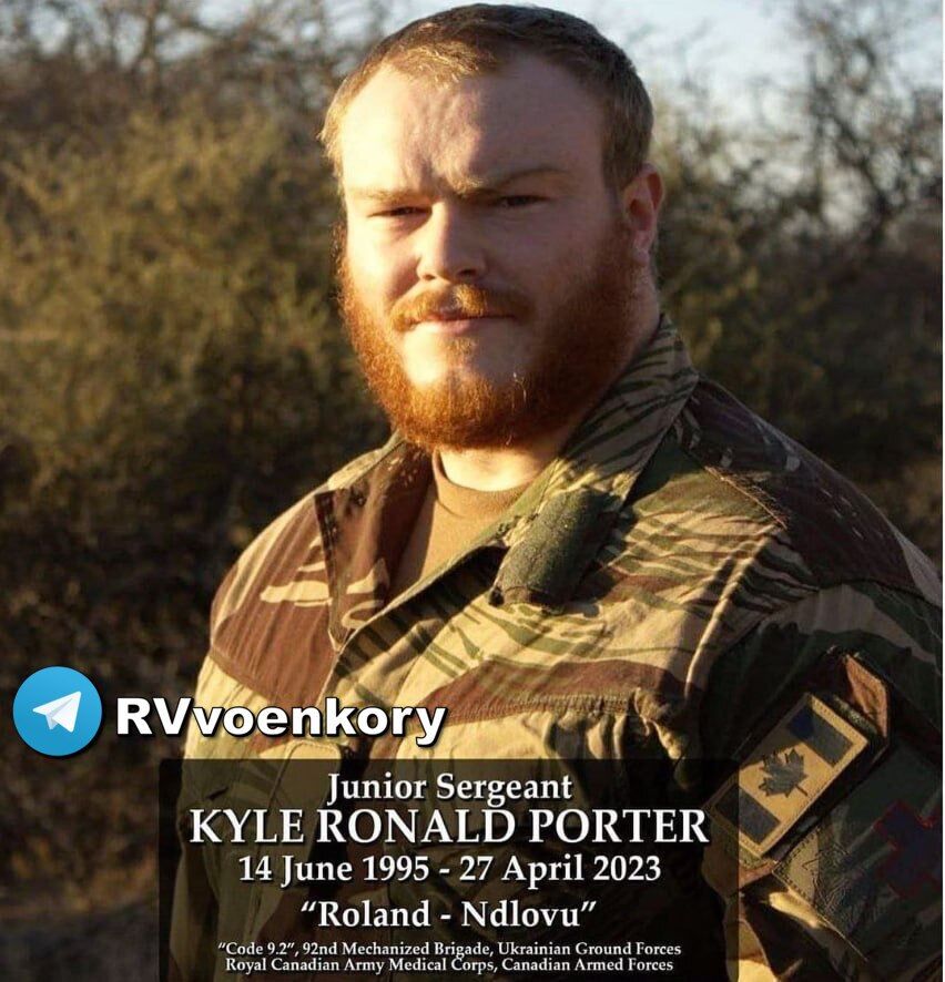 ▪️Lính đánh thuê người Canada Kyle Ronald Porter, cựu quân nhân Canada, chiến đấu trong lữ đoàn 92 của Lực lượng vũ trang Ukraine, đã bị thanh lý tại Artemovsk (Bakhmut) vào ngày 27 tháng 4.