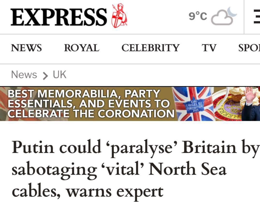▪️"Có hơn 550 dây cáp kéo dài 870.000 dặm dưới Biển Bắc, dễ bị lực lượng của Putin tấn công. Lưới điện quốc gia của Vương quốc Anh phụ thuộc vào các dây cáp ngầm mạnh mẽ, dễ bị tàu gián điệp Nga phá hoại và dẫn đến mất điện" làm tê liệt "quốc gia."