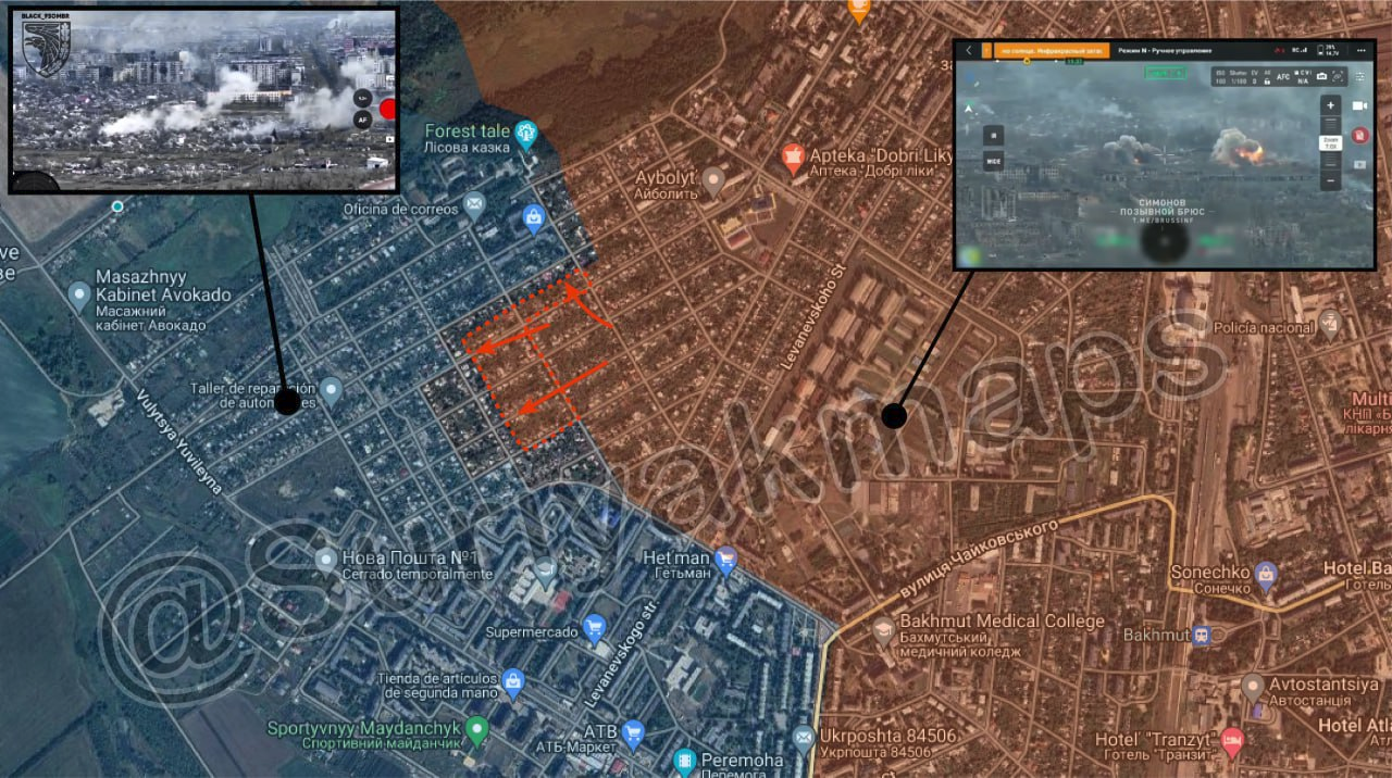 Tình hình tại thành phố Bakhmut: Đoạn video cho thấy Quân đội Nga gần đây đã hành động để chiếm khu phức hợp nhà để xe lớn, thực tế đã bị san bằng thành đống đổ nát (48.595149, 37.974753). Ngoài ra, video gần đây từ phía Ukraine cho thấy pháo binh Nga nã pháo vào các vị trí của quân đội Ukraine gần bệnh viện Nhi đồng (48.595865, 37.955735) khi quân đội của họ đang tiến về đường Larysy Shepitko. Bất chấp các báo cáo mới nhất, quận 18 vẫn nằm dưới sự kiểm soát hoàn toàn của Ukraine.