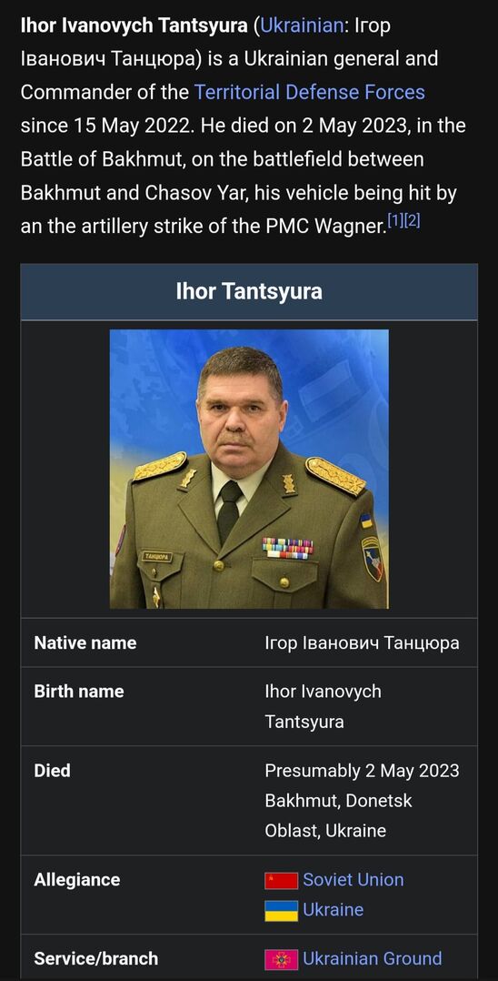 Người phát ngôn của Lực lượng Phòng vệ Lãnh thổ (TrO) của Lực lượng Vũ trang Ukraine Denis Zelinsky đã phủ nhận cái chết của chỉ huy lực lượng TrO, Thiếu tướng Igor Tantsyura.