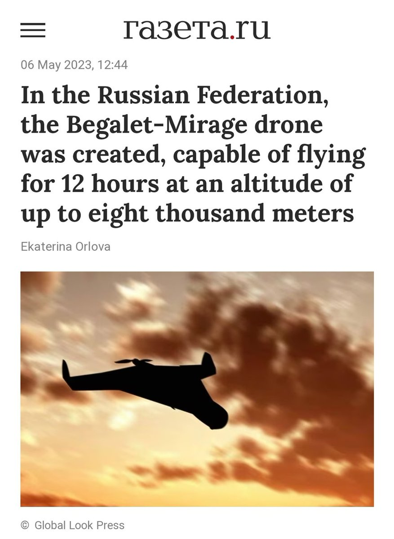 Nga đã phát triển UAV mới có khả năng bay tới 12 giờ ở độ cao 8.000 m. Máy bay không người lái được phát triển bởi Công ty Phát triển Hàng không và Không gian BEGAK LLC: "Chúng tôi đã tạo ra một thiết bị có trọng lượng cất cánh là 75 kg, 20 trong số đó là tải trọng có thể có và độ cao bay là 8.000 m."