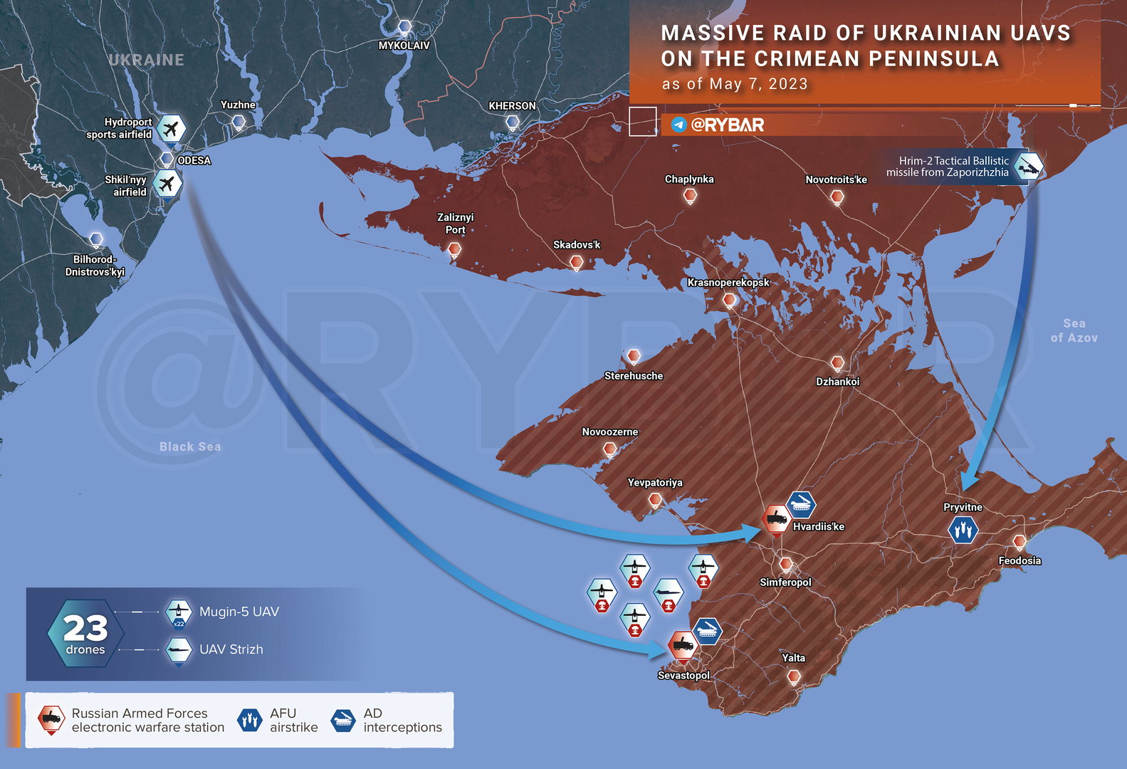 Lực lượng vũ trang Ukraine đã phóng 23 UAV (22 loại Mugin-5 và một UAV phản lực Tu-141 Swift hoán cải) thành ba nhóm trung bình 7 UAV từ các sân bay Shkolny ở Odessa và Hydroport ở ngoại ô phía tây bắc của thành phố.